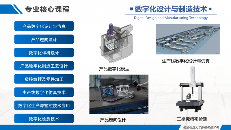 机械制图、工程力学、机械设计基础、现代检测技术、电工电子学、气动与液压传动技术、产品数字化设计与仿真、产品逆向设计、产品数字化制造工艺设计、数控编程及零件加工、生产线数字化仿真技术、数字化生产与管控技术应用、数字化检测技术、数字化设计与制造综合技能实训等。